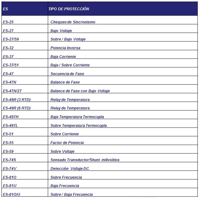 - Relés de protección unifuncionales serie ES, proporcionan una amplia variedad de opciones de bajo costo para simplificar la protección relacionada con transferencia automática, distribución, generadores, motores, control de procesos y transformadores. Múltiples opciones de montaje disponibles en rieles DIN.