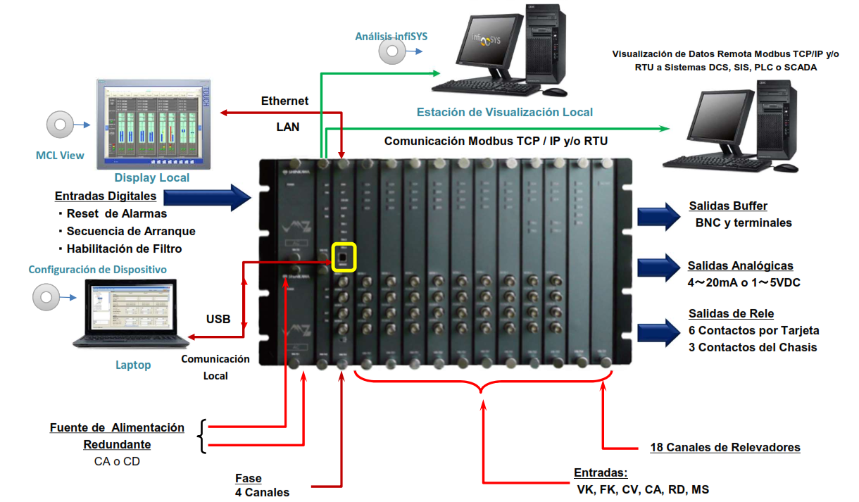 • Un rack de 19 pulgadas maneja hasta 44 canales de vibración.