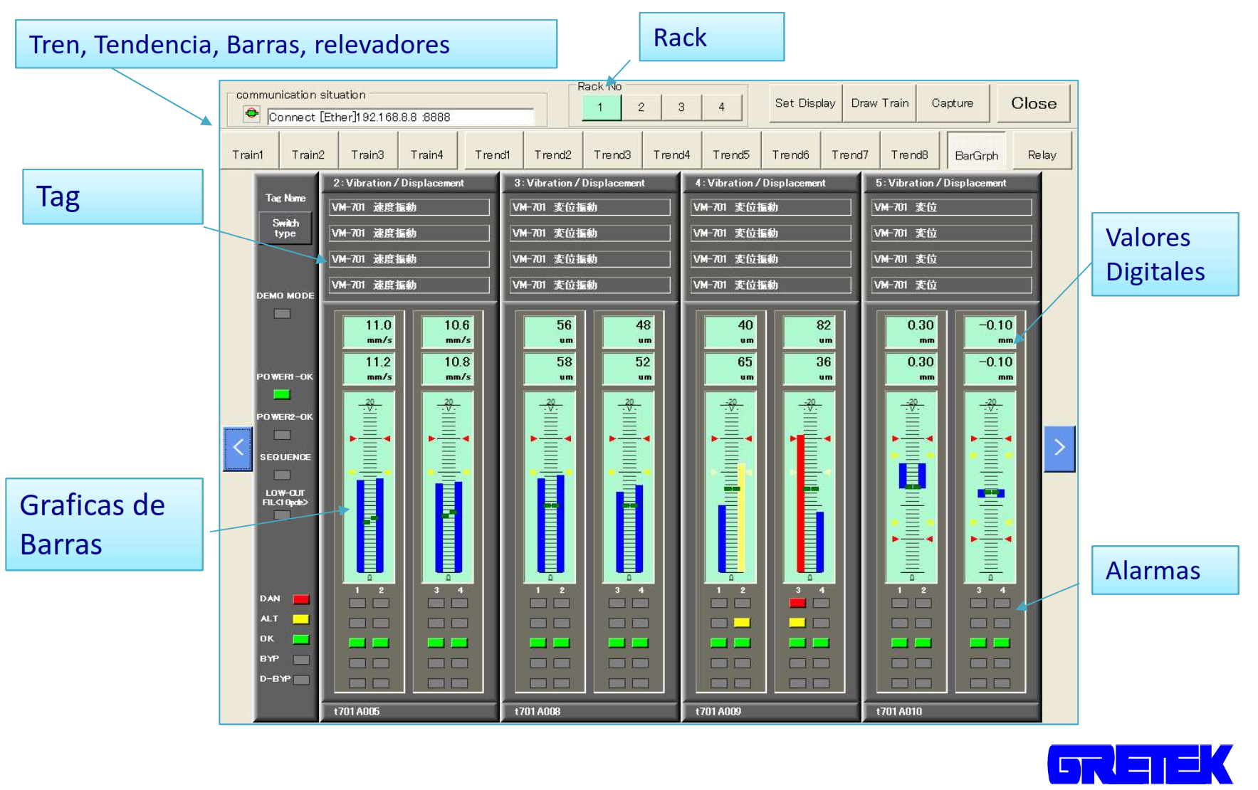 Las señales transmitidas desde el sensor instalado a las maquinarias giratorias se ingresan al módulo del monitor.